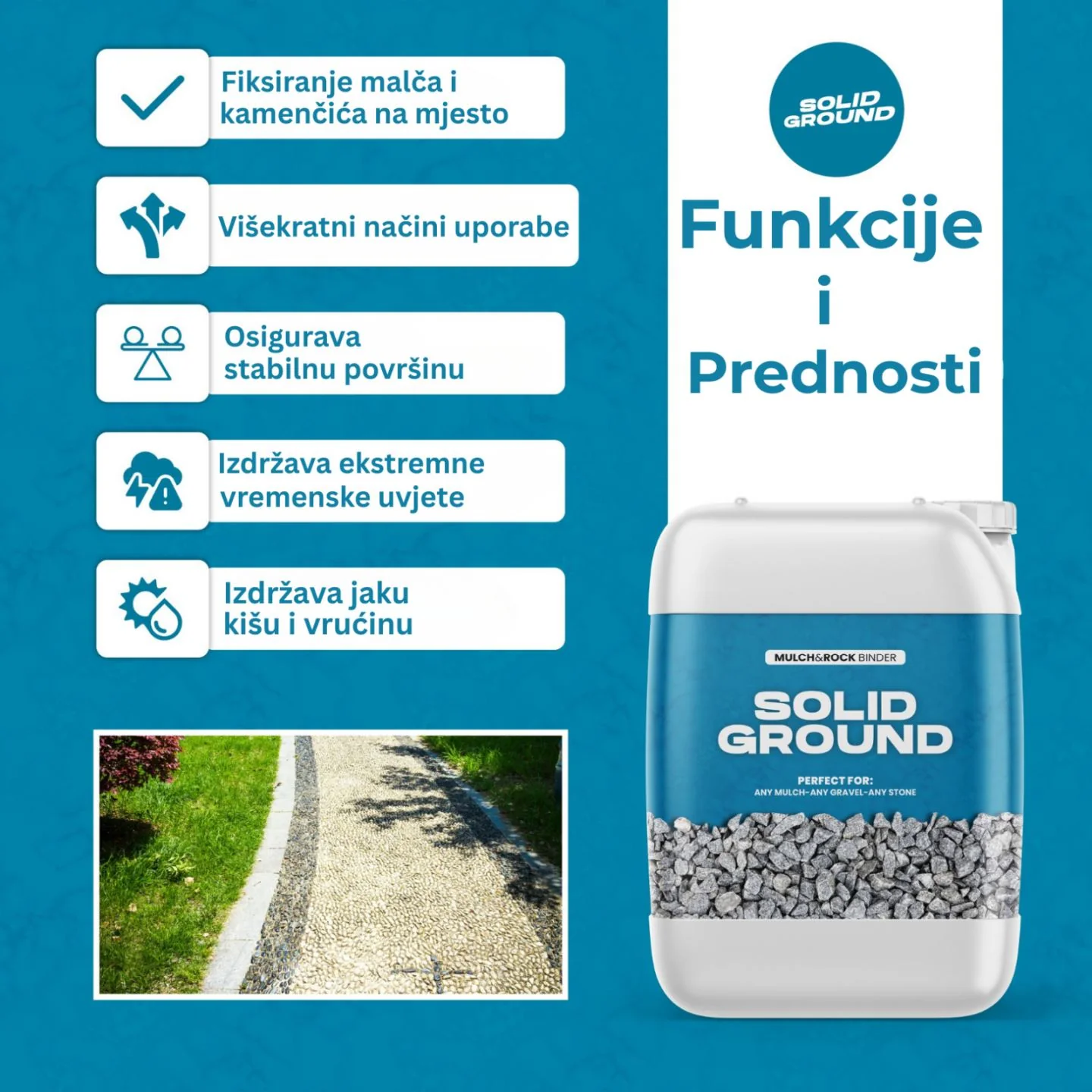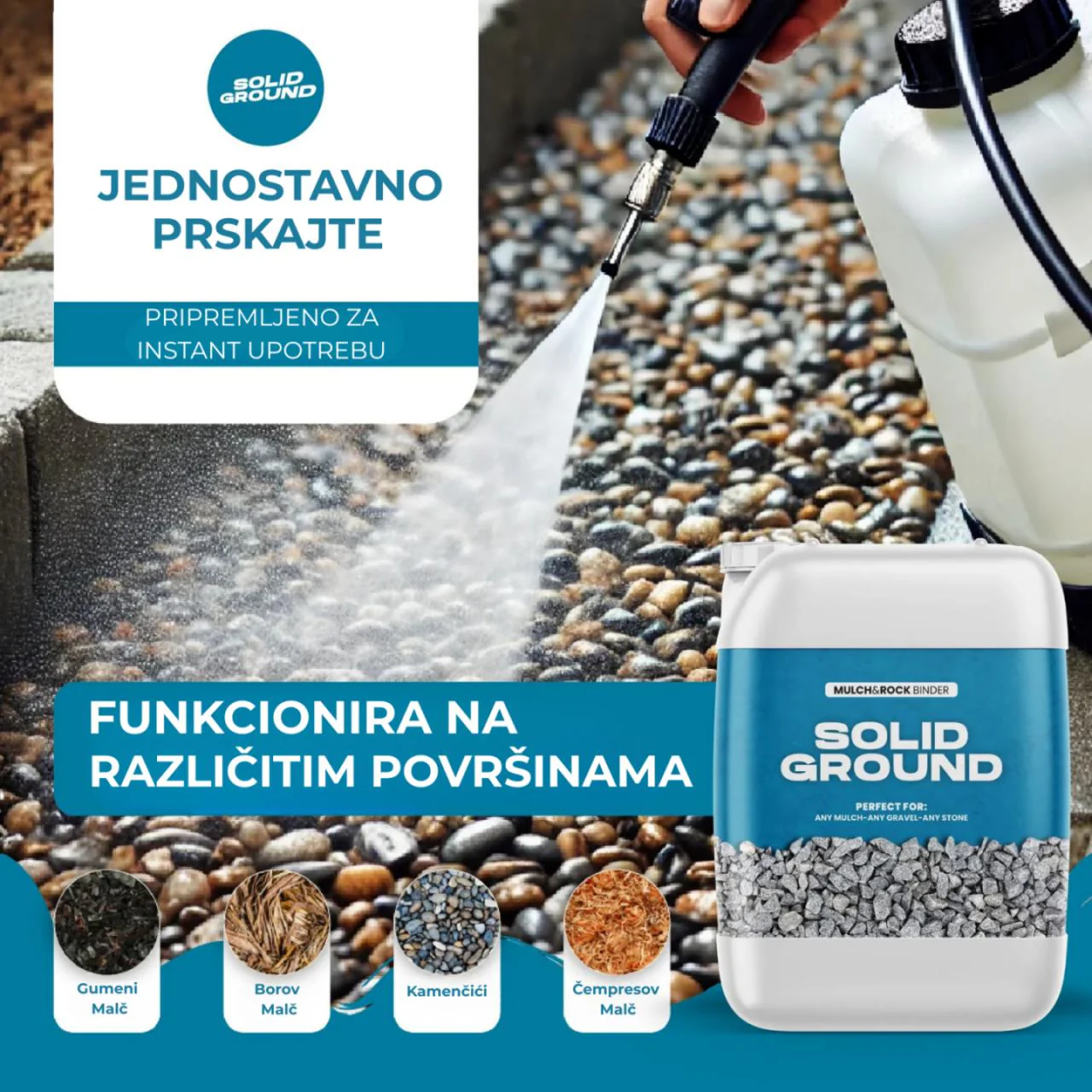 SOLID GROUND je koncentrirani agens koji osigurava snažno prianjanje i dugotrajnu stabilnost malča i kamenčića, sprječavajući njihovo rasipanje i eroziju.